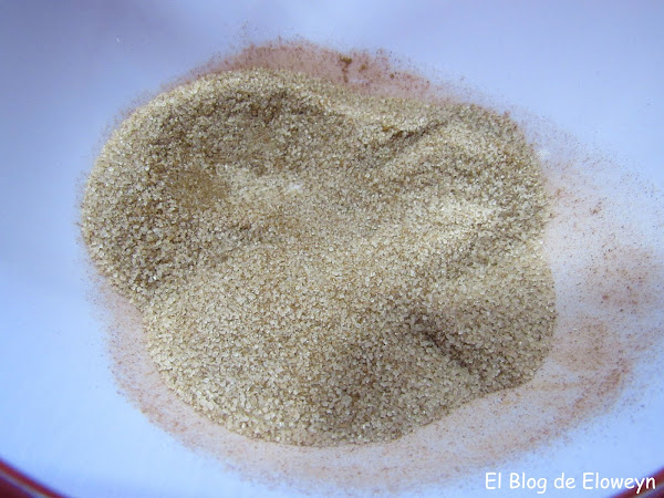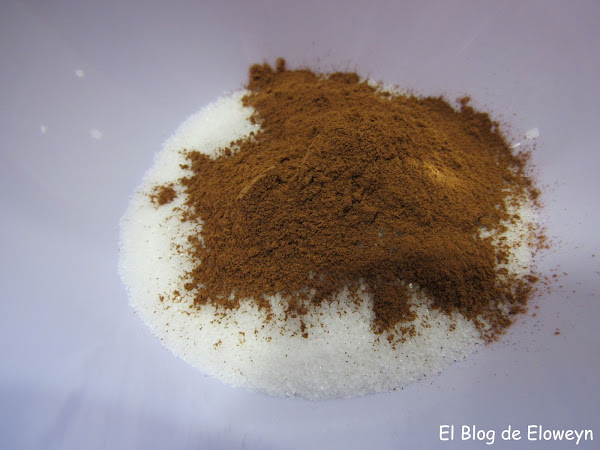 En un recipiente ponemos los 40 gramos de azúcar blanco. Le añadimos 5 gramos de canela en polvo.