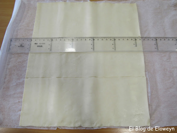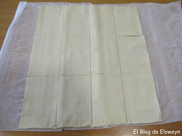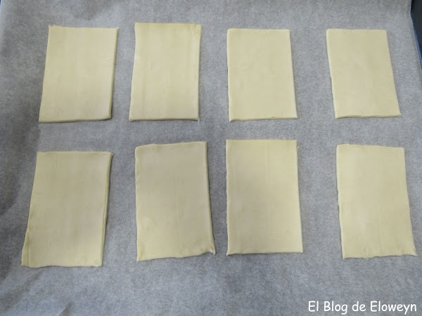 Precalentamos el horno a 180º con calor arriba y abajo. A continuación, extendemos la primera masa para empanadas y la cortamos en rectángulos de unos 6,5 x 10 cms. Usamos una regla bien limpia para ayudarnos.