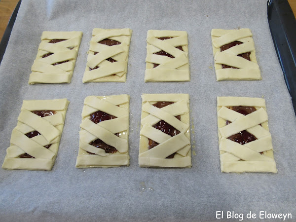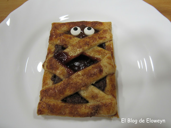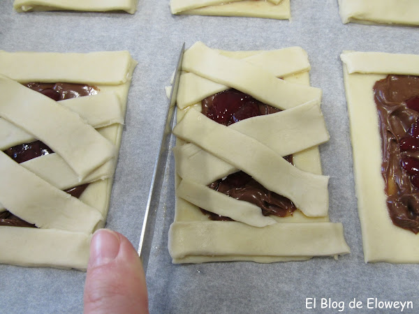 Distribuimos las tiras de masa de empanada que hemos cortado formando aspecto de momia. Tened cuidado de dejar un trozo sin tiras en la parte superior con suficiente espacio para poner los ojos más tarde.