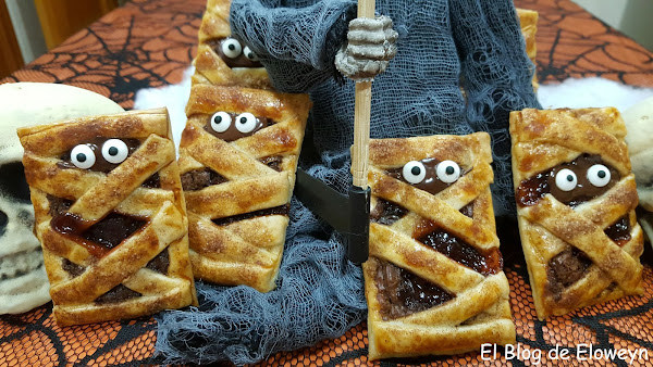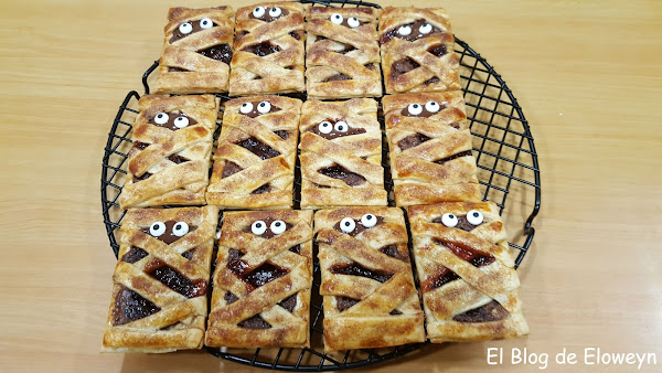 Introducimos las momias en el horno, que previamente habíamos calentado a 180º con calor arriba y abajo. Las horneamos hasta que estén doradas. Como cada horno es un mundo, no pongo tiempo. Una vez estén doradas, sacadlas del horno y ponedlas sobre una rejilla para que se enfríen.
