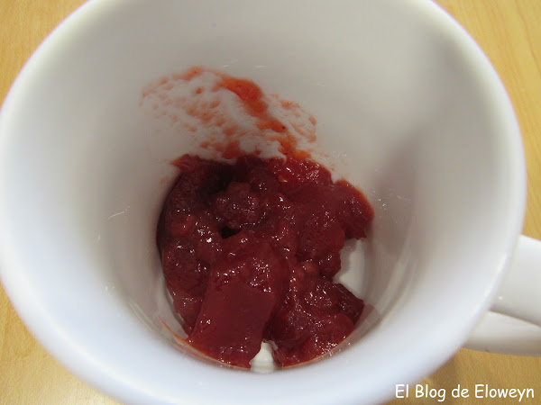 A continuación, seguimos con la mermelada. Para que sea más fácil de repartir, pondremos los 75 gramos de mermelada en un recipiente apto para microondas. Yo usé una taza.