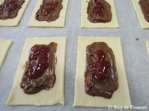 Ponemos la mermelada de fresa sobre la nocilla. En la foto hay poca cantidad. Quedará más sangriento si le ponéis más.