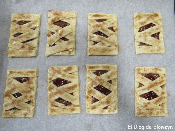 Separamos los rectángulos y los ponemos en una bandeja apta para horno cubierta con papel para hornear. Seguramente no os cabrán todos en una sola bandeja y tendréis que hornearlos en dos veces. Aquí tenéis mi primera bandeja: