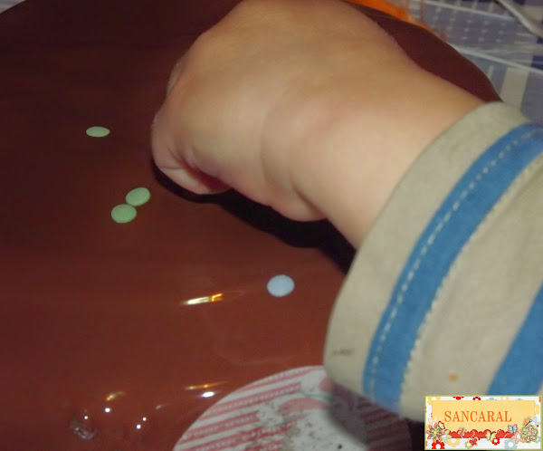 Una vez rellenados los bizcochos he derretido chocolate para cubrir los bizcochos y ahora era el turno de los artistas ......