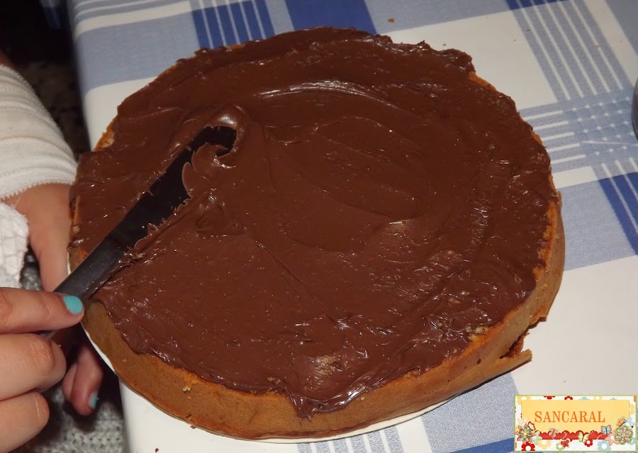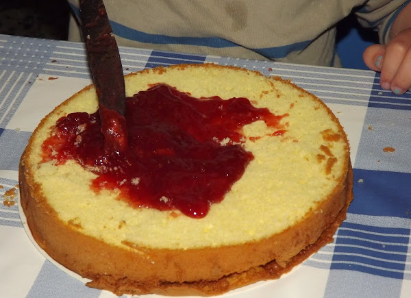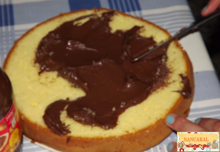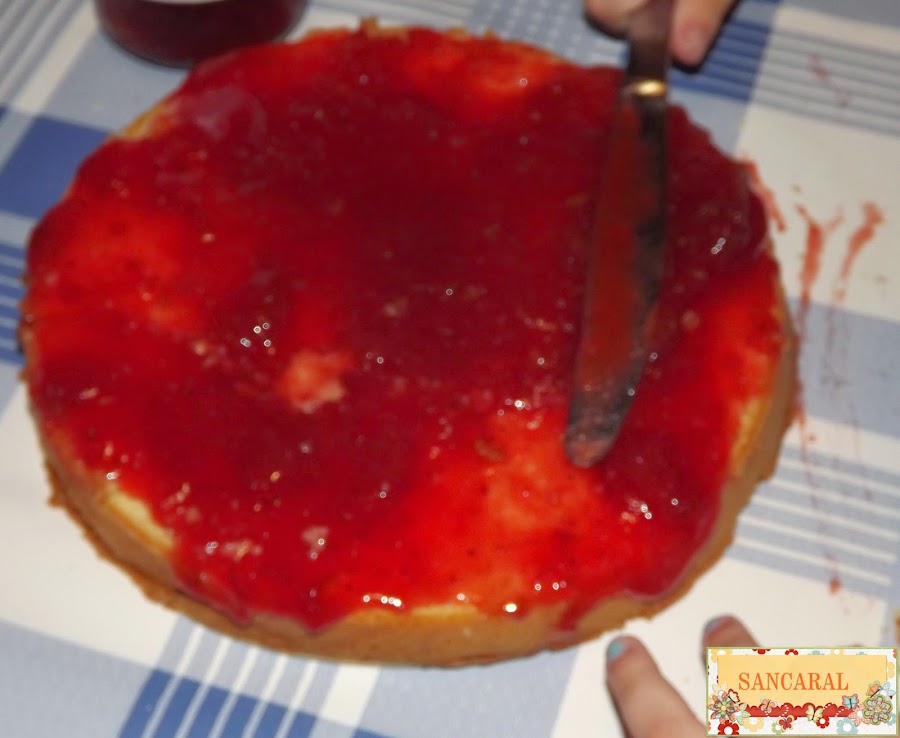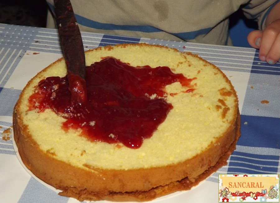 Lo primero que hago es abrirlo y cada uno rellena el bizcocho del otro, así que mi niña lo relleno de nocilla y mi niño la relleno de mermelada de fresa