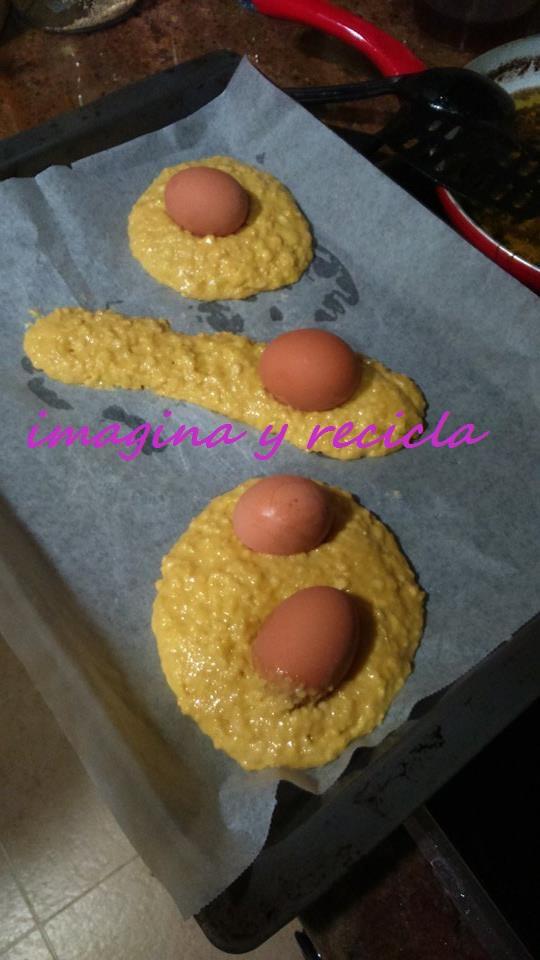 Si cocemos los huevos antes nos garantizamos que no se queden medio hechos si los ponemos con las monas al horno crudos.