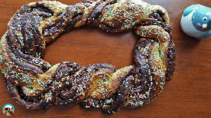 3.- A continuación amasamos de nuevo la masa, la estiramos y formamos con un rodillo. la rellenamos con la crema de cacao. Formamos un rollo con la masa, con un cuchillo la cortamos en dos mitades. Formamos una trenza y la cerramos en círculo. Colocamos la trenza sobre una placa de horno cubierta por papel de horno. Dejamos reposar la masa 10 minutos. La pincelamos con un huevo batido, la decoramos con los fideos de azúcar. Precalemos el horno a 180º cocinamos la mona de pascua 25 o 30 minutos.