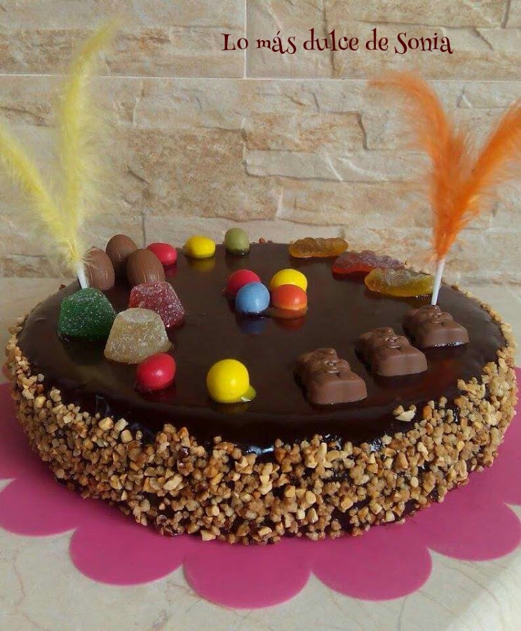 Yo adorne los laterales con cubitos de almendra, adorne con gominolas y chocolatinas.