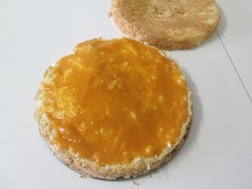 Partimos el bizcocho por la mitad horizontalmente y lo untamos con mermelada de melocotón.