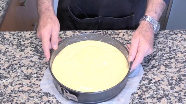 Para cocer el bizcocho utilizaremos un molde desmontable de 28 centímetros de diámetro. Forramos la base con papel vegetal y después ponemos el aro. Untamos la base y los lados del molde con un poco de mantequilla. Añadimos la masa al molde y damos unos golpecitos para que salgan las burbujas de aire.