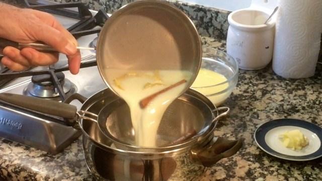 Una vez esté fría colamos la leche y sacamos la piel del limón y la canela.