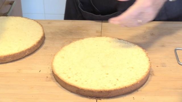 Daremos la vuelta al bizcocho y lo abriremos por la mitad. Pintaremos las dos caras con el almíbar.