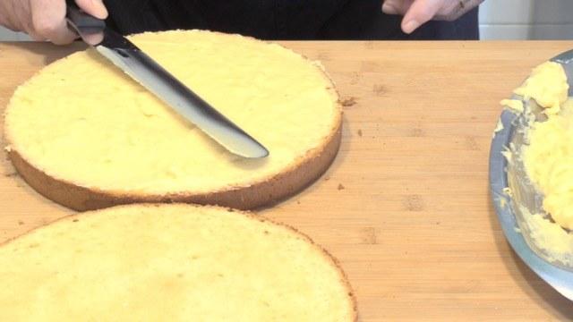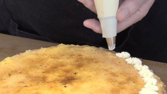 Con una espátula removeremos la crema pastelera para que sea más fácil el manejarla. Extenderemos crema pastelera por encima de la parte de abajo del bizcocho y la distribuiremos, alisándola bien.