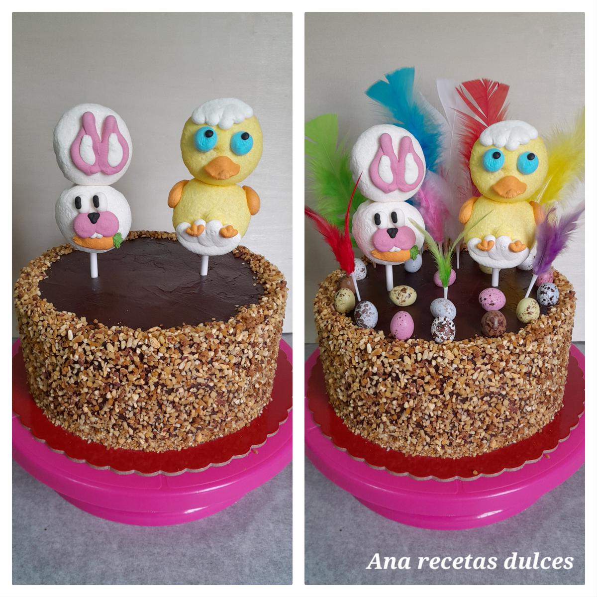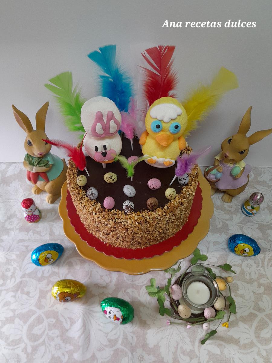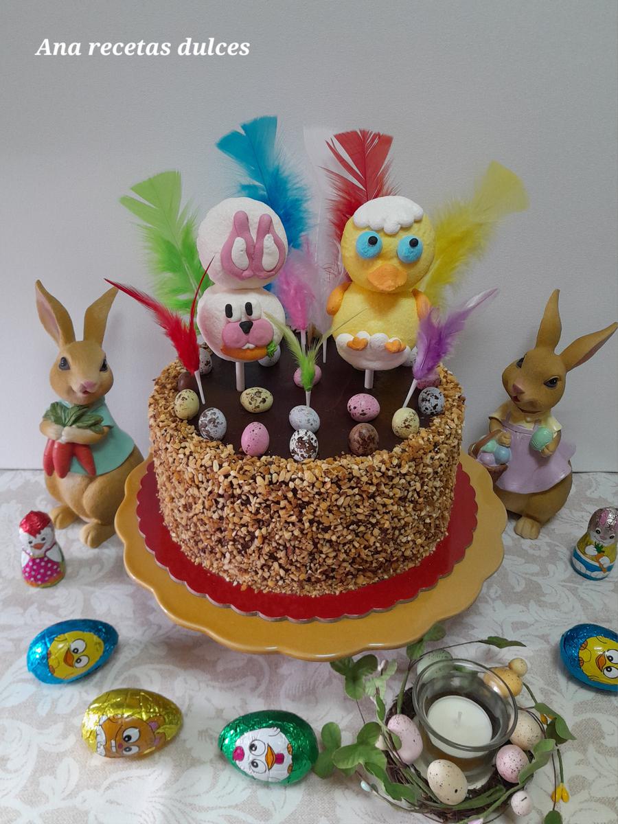 Por último, decoramos la tarta a nuestro gusto, (Yo la he decorado con figuras de azúcar, huevos de codorniz de cereal y chocolate y unas plumas decorativas).