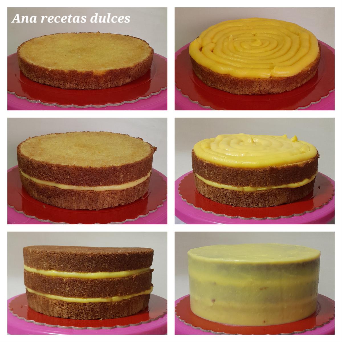 Ponemos el primer bizcocho en el plato o stand donde lo vamos a servir, ponemos una capa generosa de crema pastelera y repartimos de forma uniforme por toda la superficie del bizcocho (yo la he repartido con una manga pastelera).