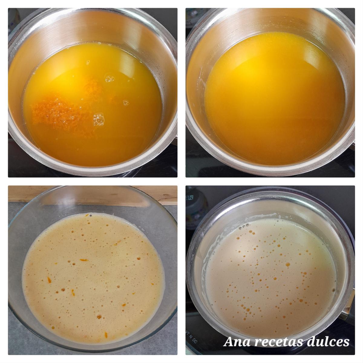 Echamos el zumo de naranja junto con la ralladura de naranja en un cazo, ponemos a fuego medio y sin dejar de remover dejamos hasta que se ponga bien caliente (no tiene que hervir), retiramos del fuego y dejamos templar.