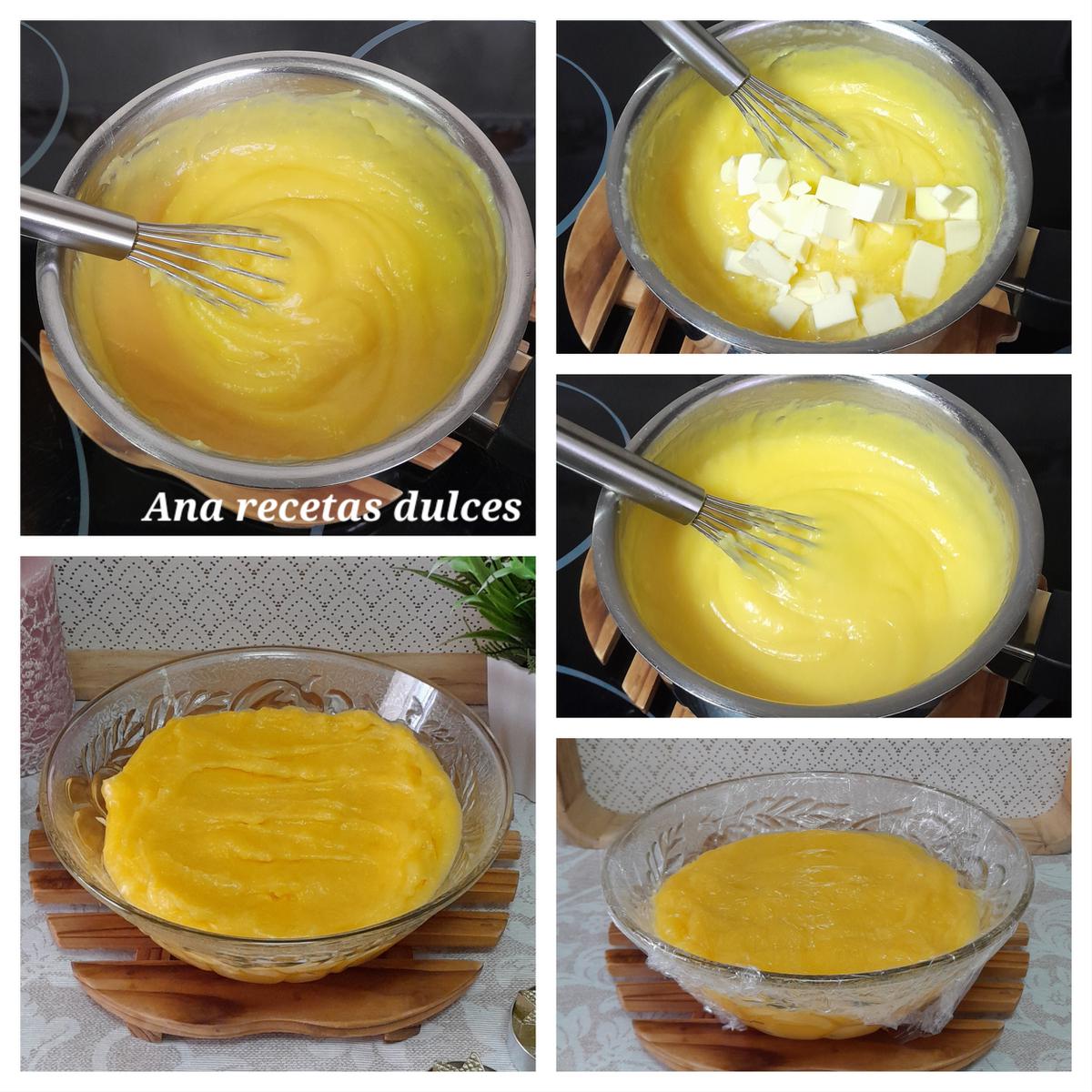 Vertemos en un bol y cubrimos con papel transparente (film) de forma que esté en contacto con toda la superficie de la crema (así evitaremos que se seque la parte superior), dejamos enfriar por completo a temperatura ambiente y luego metemos en la nevera hasta el día siguiente.
