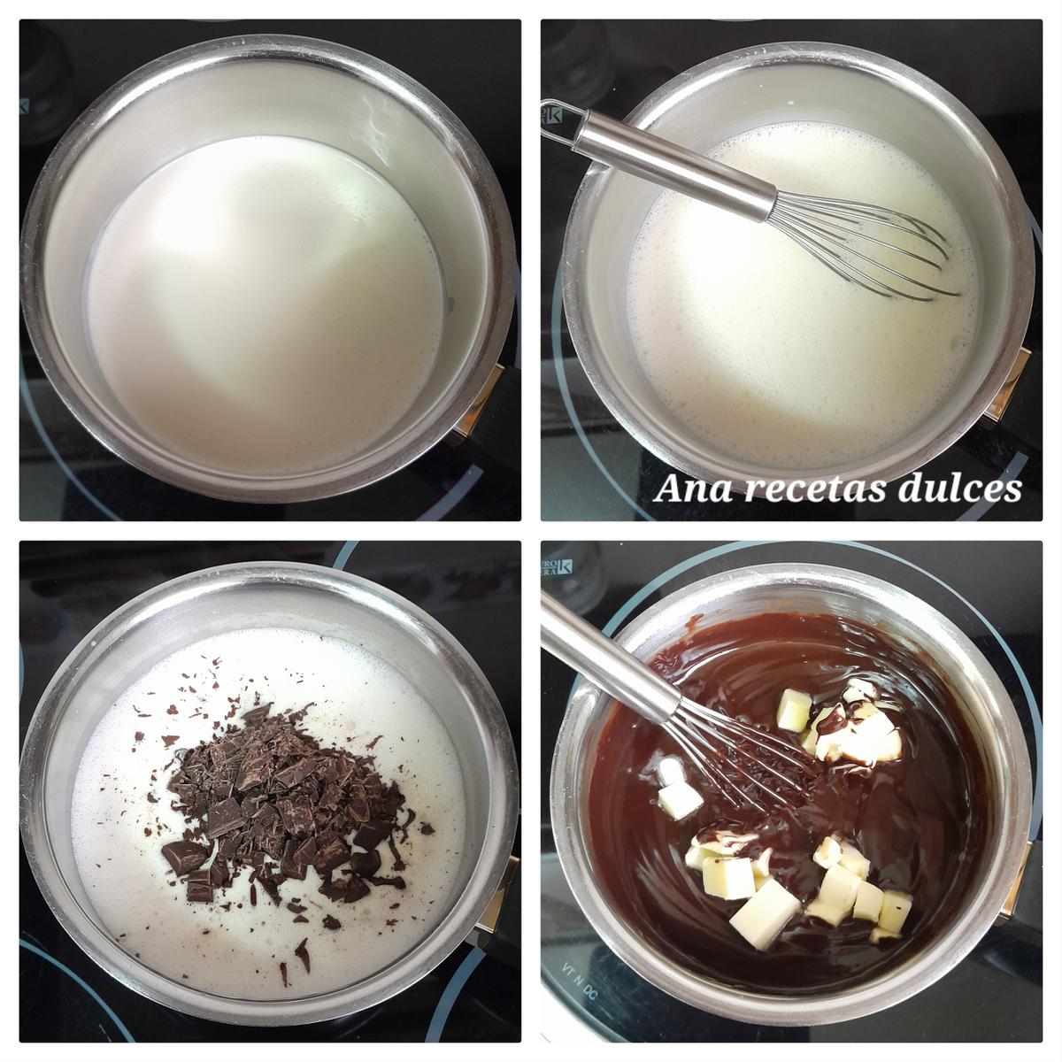 Calentamos la nata (crema de leche) hasta hervir, retiramos del fuego y añadimos el chocolate, esperamos unos minutos.