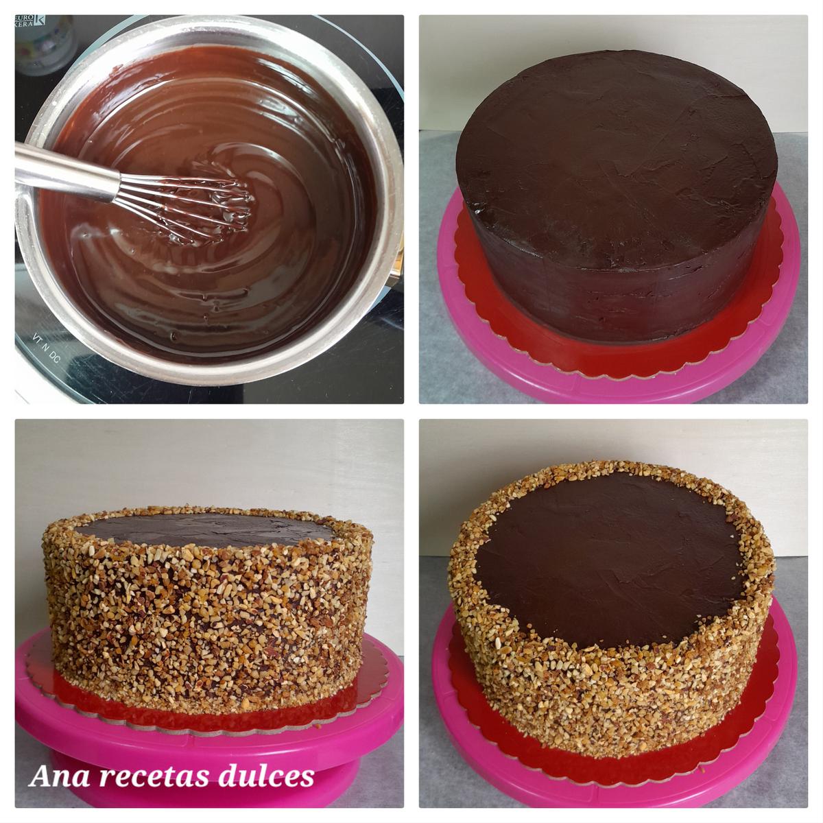 Sacamos la tarta de la nevera, ponemos una capa generosa de la cobertura de chocolate sobre la superficie y los lados de la tarta, alisamos bien ayudándonos con una paleta alisadora.