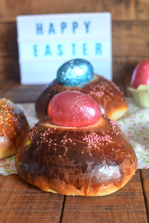 Pasado ese rato habrá crecido considerablemente. Batimos el huevo que nos había sobrado y pintamos toda la masa. Les colocamos el huevo de chocolate en el centro y en mi caso he espolvoreado sprinkles de colores.
