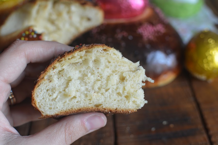 En un bol echamos la harina y desmenuzamos la masa madre que habíamos preparado sobre la harina. Añadimos el azúcar formando un agujero en el centro como de un volcán donde añadiremos los huevos, el agua de azahar, la sal y el aroma de vainilla y por ultimo la leche en la que hemos disuelto la levadura. Mezclamos todo junto y amasamos bien hasta que la masa se despegue de las paredes del bol. Finalmente añadimos los trozos de mantequilla a temperatura ambiente y seguimos amasando durante unos diez minutos hasta que veamos que se ha integrado completamente la mantequilla y nos queda una masa elástica. Volvemos a colocar la masa en forma de bola en un bol, tapamos con un trapo y dejamos que leve durante una hora.