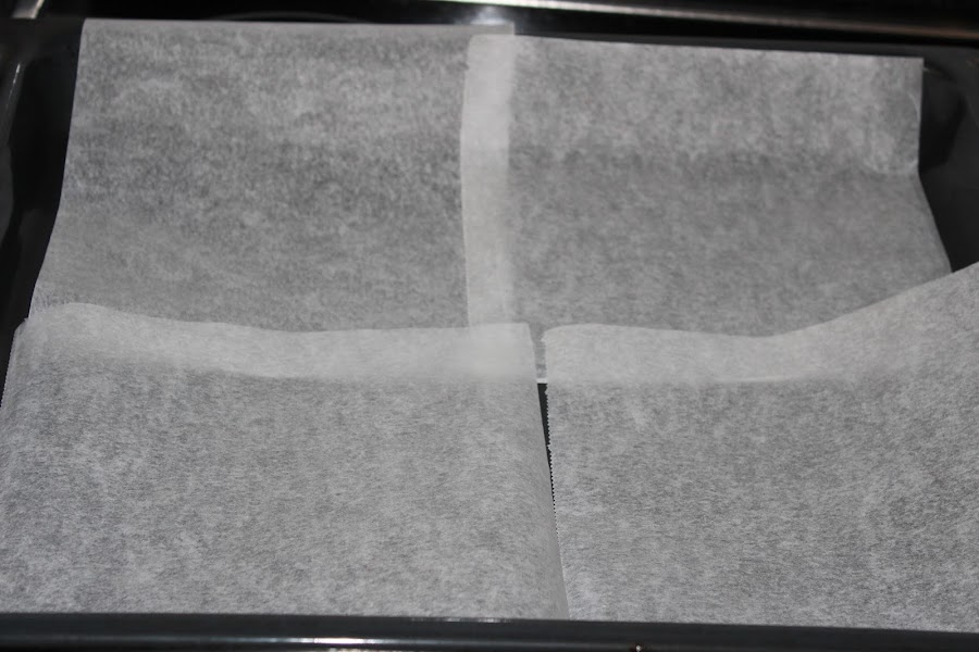 De mientras, divide una hoja de papel vegetal en cuatro partes y pon cada hoja sobre la bandeja del horno.