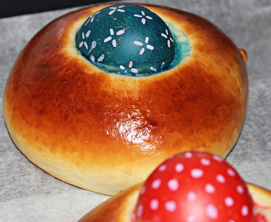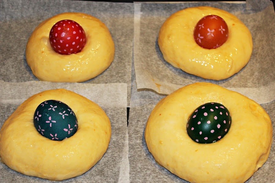 Coloca en medio de cada porción los huevos hervidos que habrás decorado previamente (paso opcional), aquí te explico cómo hacerlos: "Cómo decorar fácilmente huevos de Pascua", y pinta una vez más con huevo batido.