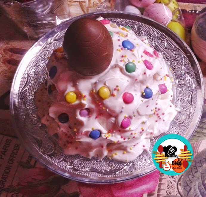 4.- Decoramos el bizcocho con la buttercream con la ayuda de una espátula de silicona. Decoramos con los caramelos y las bolas de azúcar. Sobre la mona ponemos un huevo de chocolate. Guardamos en la nevera hasta el momento de servir.