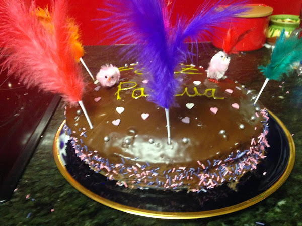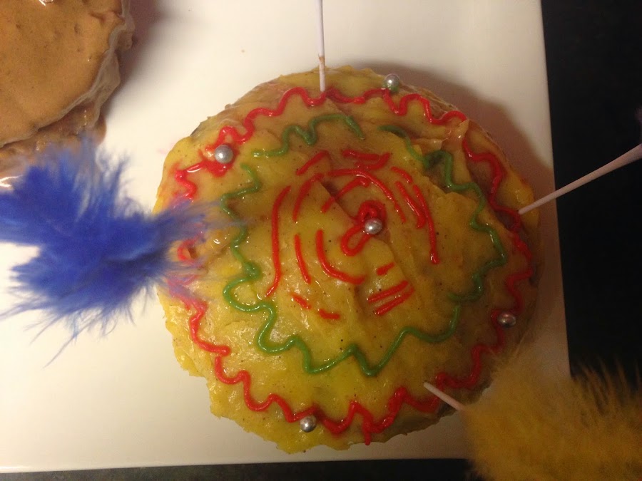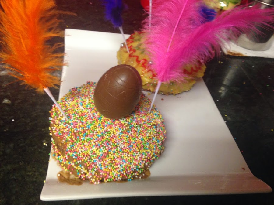 He bañado todo el pastel en mini bolitas de colores. 2 plumas y un huevo en medio.