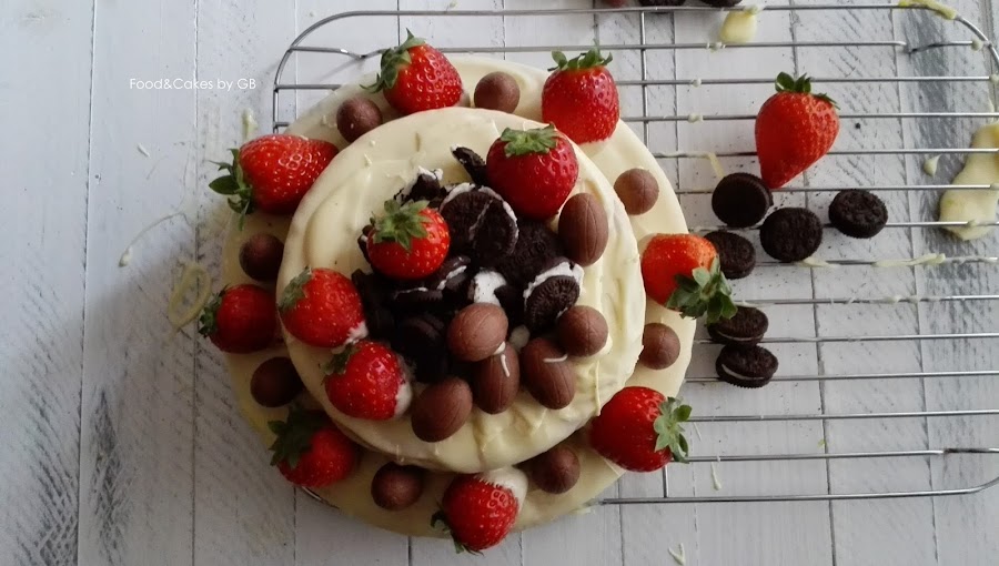 La base es el típico Genovés que sirve para hacer las mil y una tartas. Luego lo hemos bañado con chocolate blanco y decorado con unas fresas, galletas y unos huevos de chocolate para darle ese toque a Pascua.