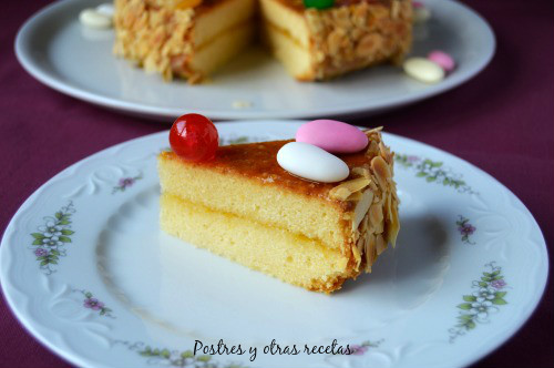 Desmoldamos el bizcocho y lo partimos a la mitad en dos discos iguales. Untamos la superficie de uno de los discos con la mermelada y ponemos el otro encima. Luego cubrimos toda la superficie y laterales del bizcocho con la yema.