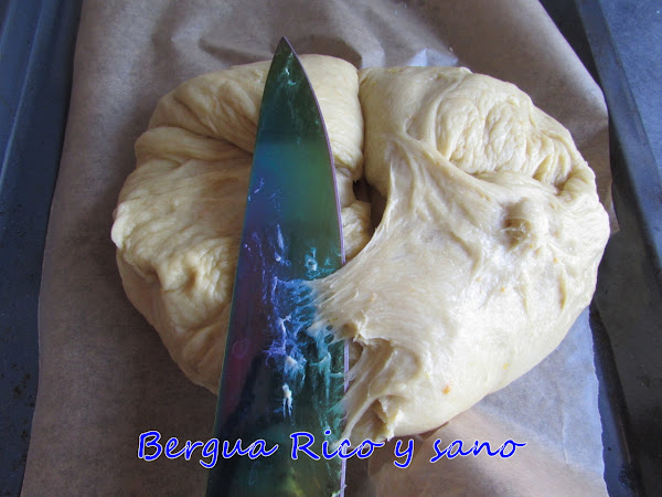 7. Pasado ese tiempo, la masa habrá triplicado su volumen. La sacamos del cuenco y la partimos en dos partes iguales (verás que vuelve a estar un poco más pegajosa por dentro). No pasa nada porque pierda algo de aire, pero tampoco la aplastes.