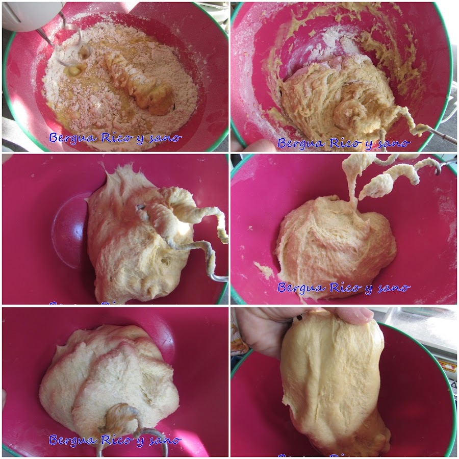 Al principio es muy pegajosa y húmeda. Cuando terminemos de incorporar toda la harina, seguirá demasiado pringosa. Hay que seguir amasando y MUY IMPORTANTE, no añadiremos en ningún momento harina. Si se nos pega a las manos, nos mojamos las manos con aceite. Hay que ir tocando de vez en cuando y meter un dedo. Las paredes del cuenco también son un buen indicador de cómo va la masa; si se pega a los bordes, le queda aún bastante; si se despega con facilidad, le queda poco, si no se pega a los bordes, ya casi está.