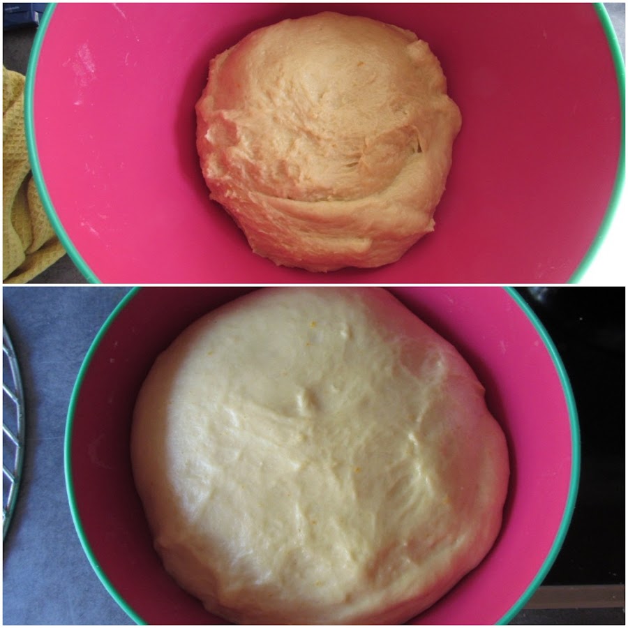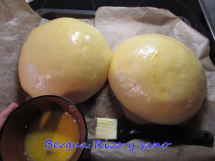 9. Pasado ese tiempo verás que han vuelto a crecer mucho. Ahora precalentamos el horno a 165º-170º con calor arriba y abajo y pintamos la superficie de las monas con huevo batido. Les damos 30 minutos. Esto es para cuando haces dos; si solo haces la mitad de la receta, puede ser suficiente con 15-20 minutos.