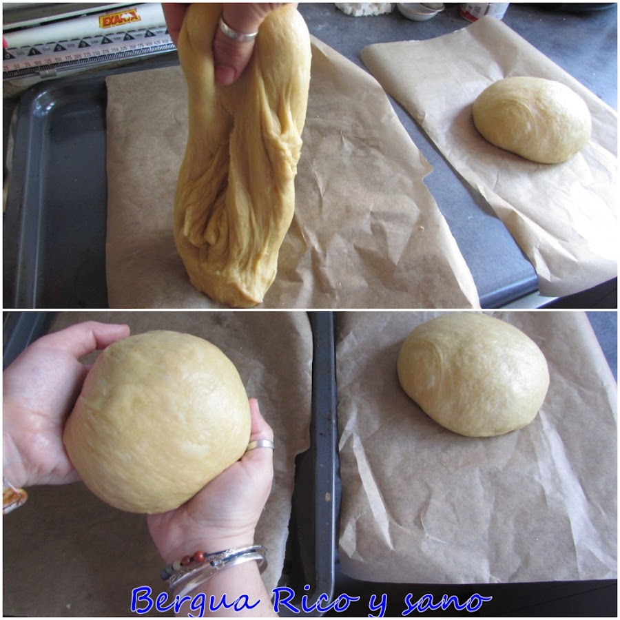 8. Tomamos una parte de la masa y formamos una bola con ella, pero no prieta o nos quedará una piedra; le damos forma con cuidado y cariño. Ahora las ponemos ya sobre la bandeja del horno para la segunda siesta o fase de levado. Otras veces las he horneado una a una, pero esta vez las hice a la vez y no hubo problema. Si no las quieres hornear juntas, las pones a levar bandejas separadas. Las devolvemos al horno a 30º y les damos otras 4 horas. A mí me gusta mucho cuando crecen unas contra otras, como siamesas, así que las dejo juntarse. Pero si no, las separas (antes del último levado).