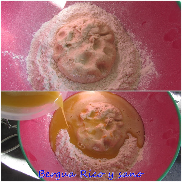 4. En un recipiente grande tenemos la harina preparada con menos de media cucharadita de sal. En el centro colocamos nuestra creciente una vez después de los 15 minutos de reposo. Vertimos la mezcla de elementos húmedos sobre la harina.
