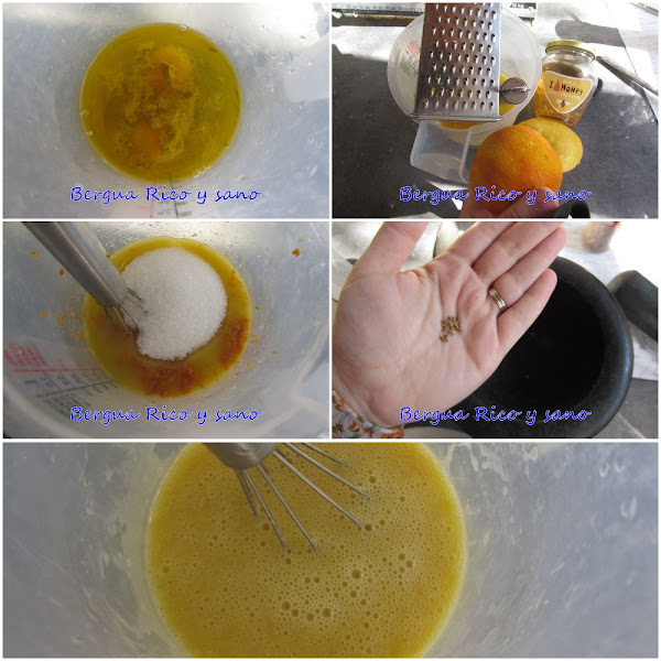 3. Por una parte mezclamos los elementos húmedos: Agua y aceite, después levadura desmenuzada o rota, 2 huevos, y la miel. Mezclamos bien y entonces añadimos el azúcar, la ralladura de limón y de naranja y batimos de nuevo ligeramente a mano para disolver el azúcar. Yo además he pulverizado un poquitín de anís en el mortero y lo he mezclado aquí.