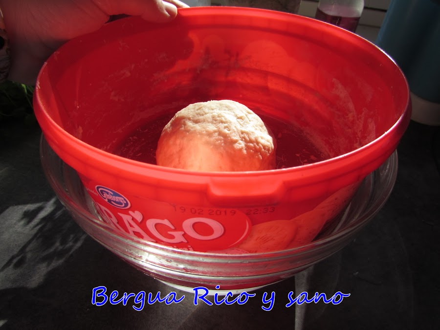 6. Colocamos la masa en un cuenco profundo, donde haya espacio para que crezca, y cubrimos con un paño humedecido para que no se seque la superficie. Yo tapo con un paño, me mojo las manos con agua y espolvoreo un poco. Le vamos a dar 3-4 horas de levado. Con el amasado hemos activado el gluten y ahora queremos que se relaje; como se dice en mi pueblo, a la masa le toca dormir. Hay que dejarlo en un lugar templado. Si es invierno o vives como yo en un sitio frío, recomiendo dejarla dormir en el horno con calor arriba y abajo, sin aire/ventilador a 30º (menos del mínimo).