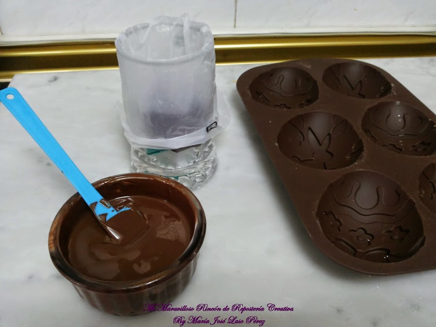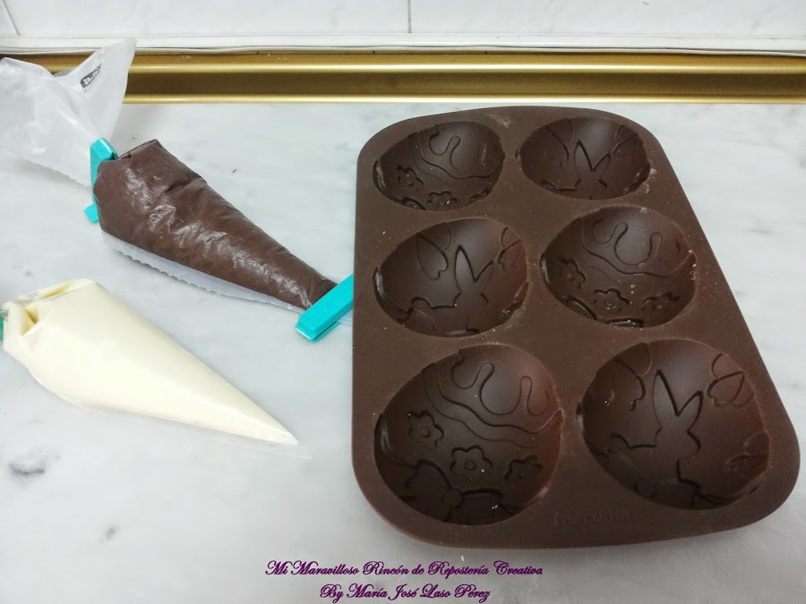 (Con estas cantidades he obtenido 3 huevos de chocolate blanco y tres huevos de chocolate negro)