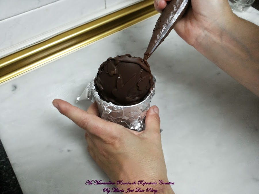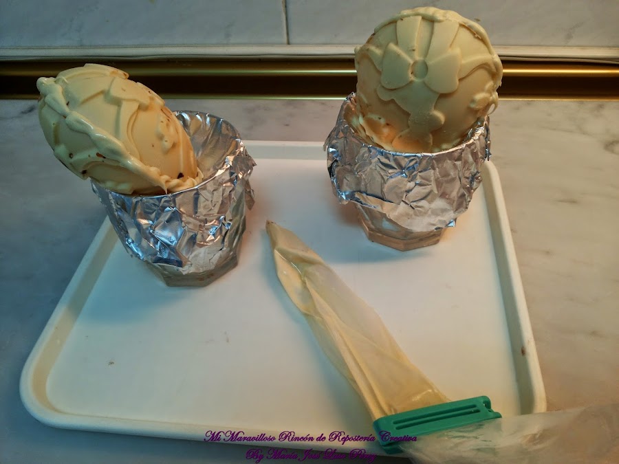 Juntamos las dos mitades, con la manga ponemos chocolate y unimos. Usamos de nuevo los vasos forrados con papel de aluminio, que nos servirán de soporte y evitaran que se nos derritan si los tocamos con las manos.