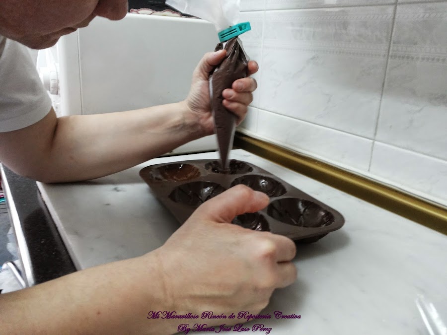Yo lo pongo en una manga pastelera para que me resulte más fácil rellenar el molde.