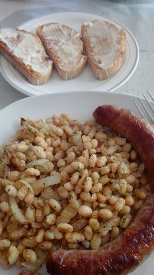 Sofreímos la media cebolla con los ajos. Cuando empiezan a coger color añadimos las monchetas blancas cocidas damos unas vueltas y añadimos perejil picado por encima. En una sartén asamos a fuego lento las butifarras y las ponemos en un plato junto con las monchetas.