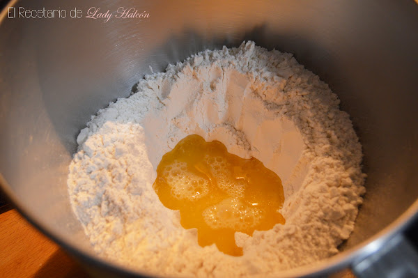 En el bol de la batidora (o en uno normal si lo vas a amasar a mano) coloca la harina. Haz un hueco en el centro y coloca ahí el resto de ingredientes: el huevo ligeramente batido, el azúcar, la mantequilla, la leche con la levadura y la sal.