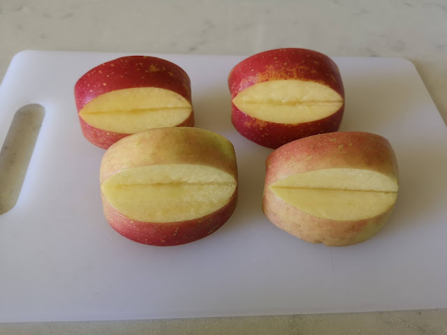 1. Empezamos lavando bien las manzanas ya que las vamos a consumir con la piel, y la cortamos en cuartos. Retiramos la zona de las pepitas.