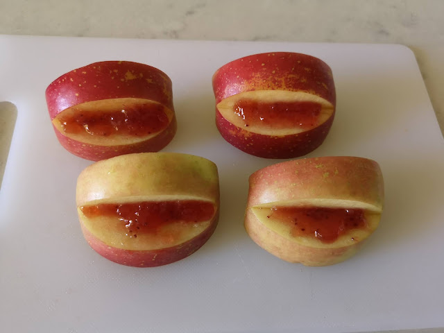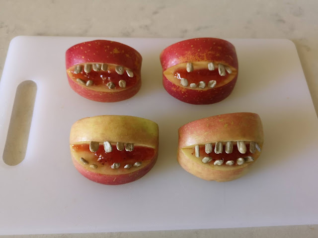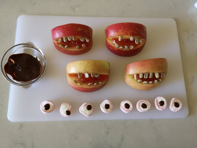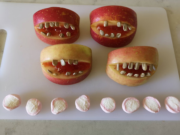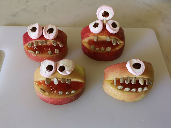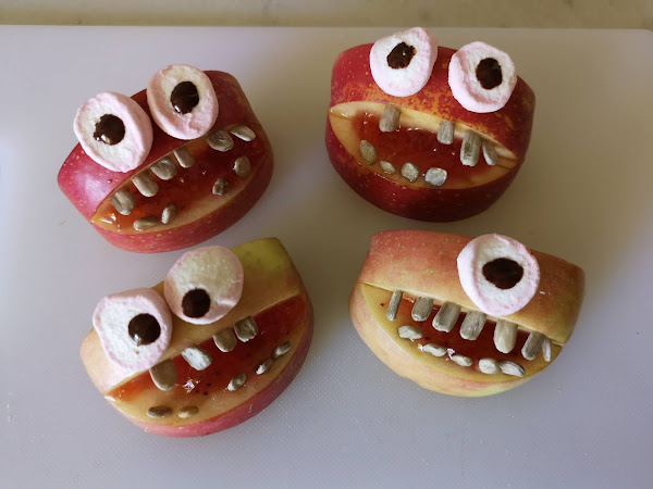 Lo mejor de esta receta (si es que se la puede llamar "receta") es que es realmente fácil, rápida de hacer y con ingredientes de andar por casa. De verdad que se tarda nada en preparar estos monstruitos de manzana y el resultado es bien divertido. Además, es una buena manera de hacer que los peques merienden de forma saludable, los cuales, por cierto, pueden ayudar a hacerlos.