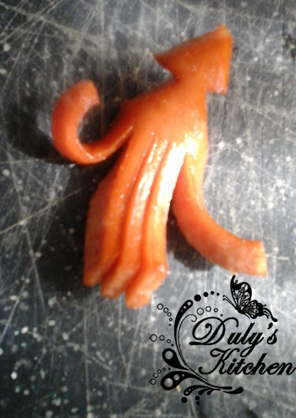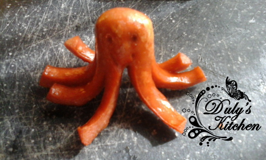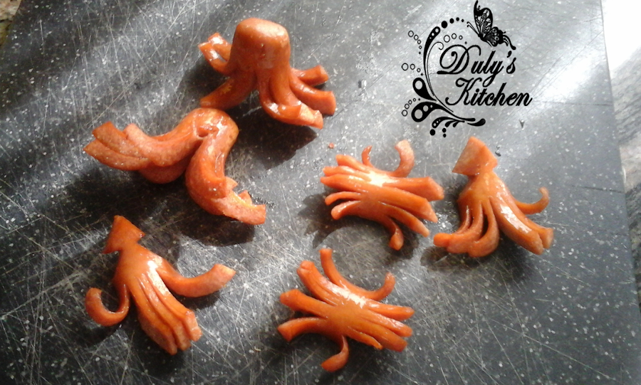 1- Aprovechamos la parte sobrante cortada de la salchicha al hacer el calamar...