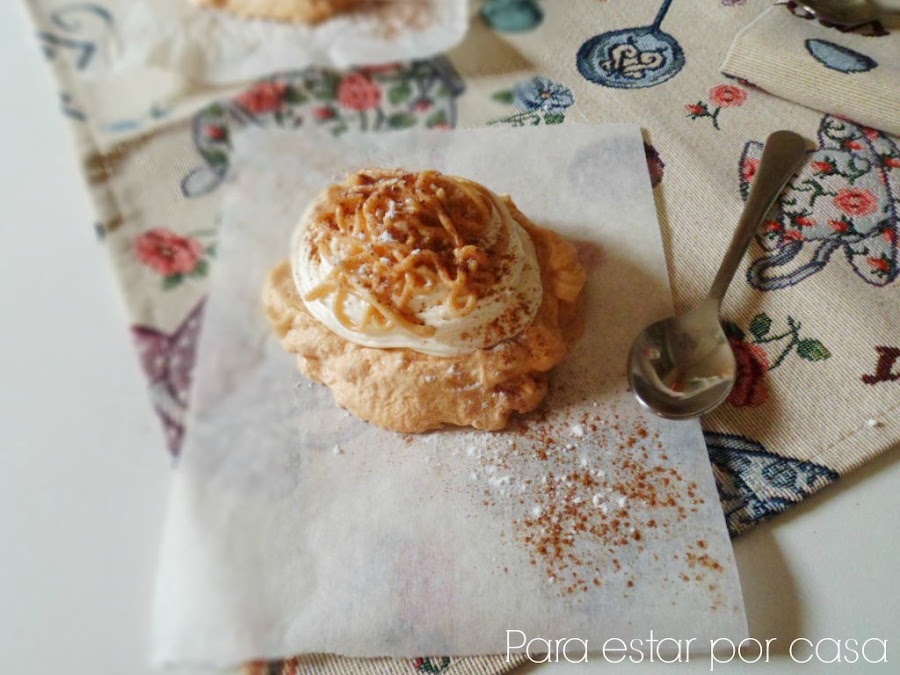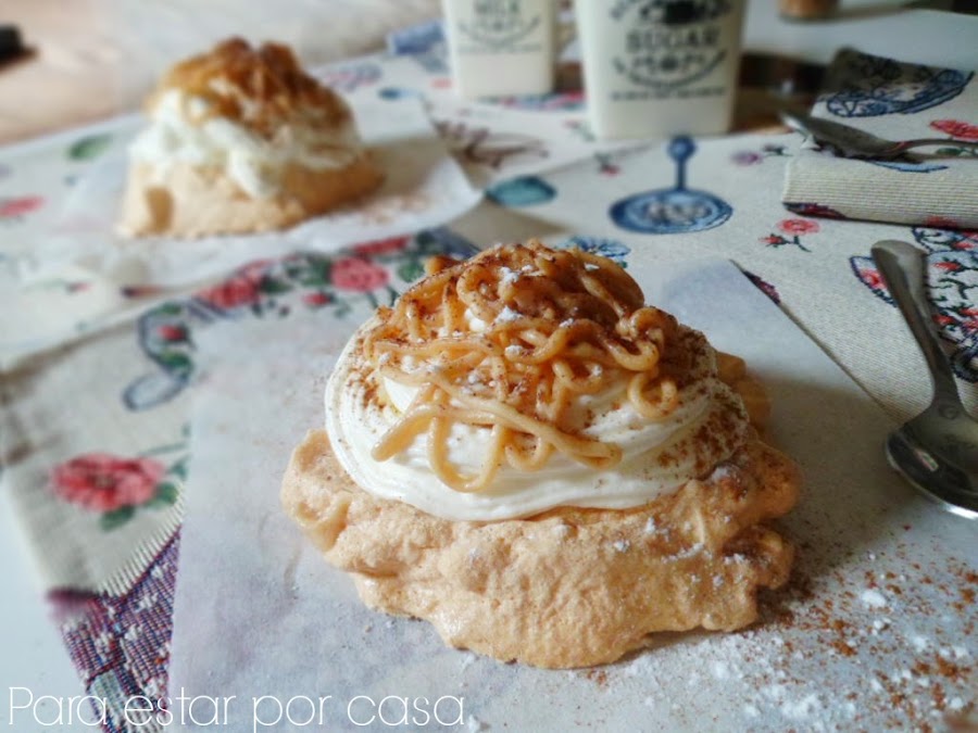 Sobre las bases de merengue, pondremos una cucharada pequeña de crema de almendras. Y, sobre ésta, pondremos un buen copete de nata montada (crema de leche). Para finalizar, unos fideos de crema de almendras por encima. Y, como toque final, espolvorearemos con canela molida y azúcar glasé.
