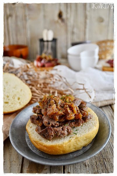 En realidad, este montadito se llama "Pepito de ternera y queso azul con trompetas de la muerte" pero yo no quise variar el nombre de su entrada, y además, no pude añadirle ni queso azul, ni este tipo de setas, así que decidí dejarlo de la primera manera.