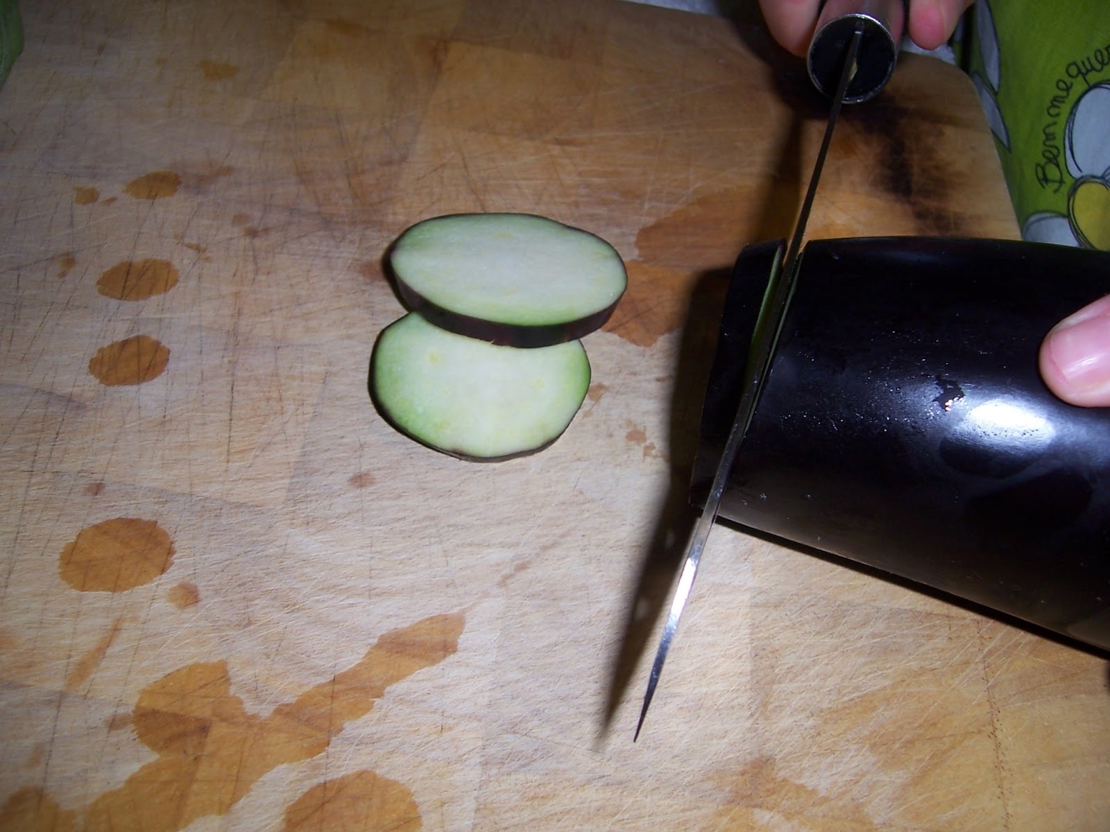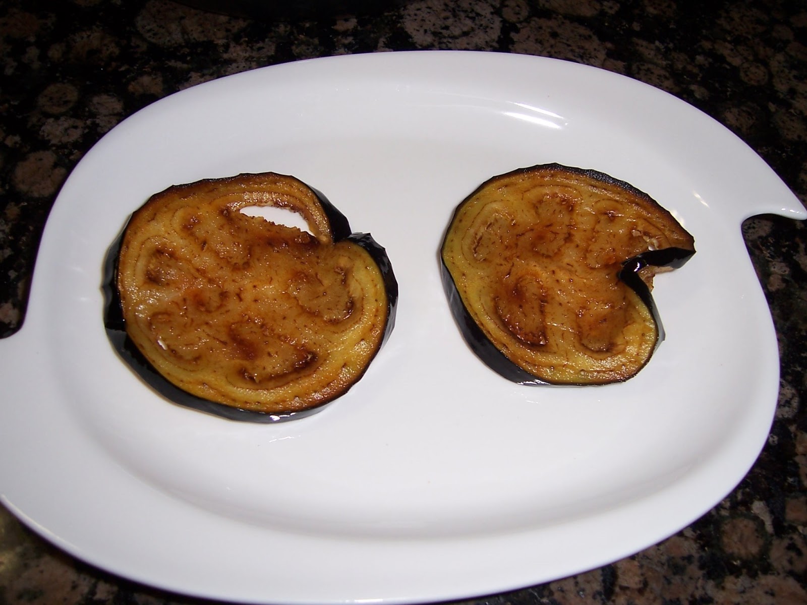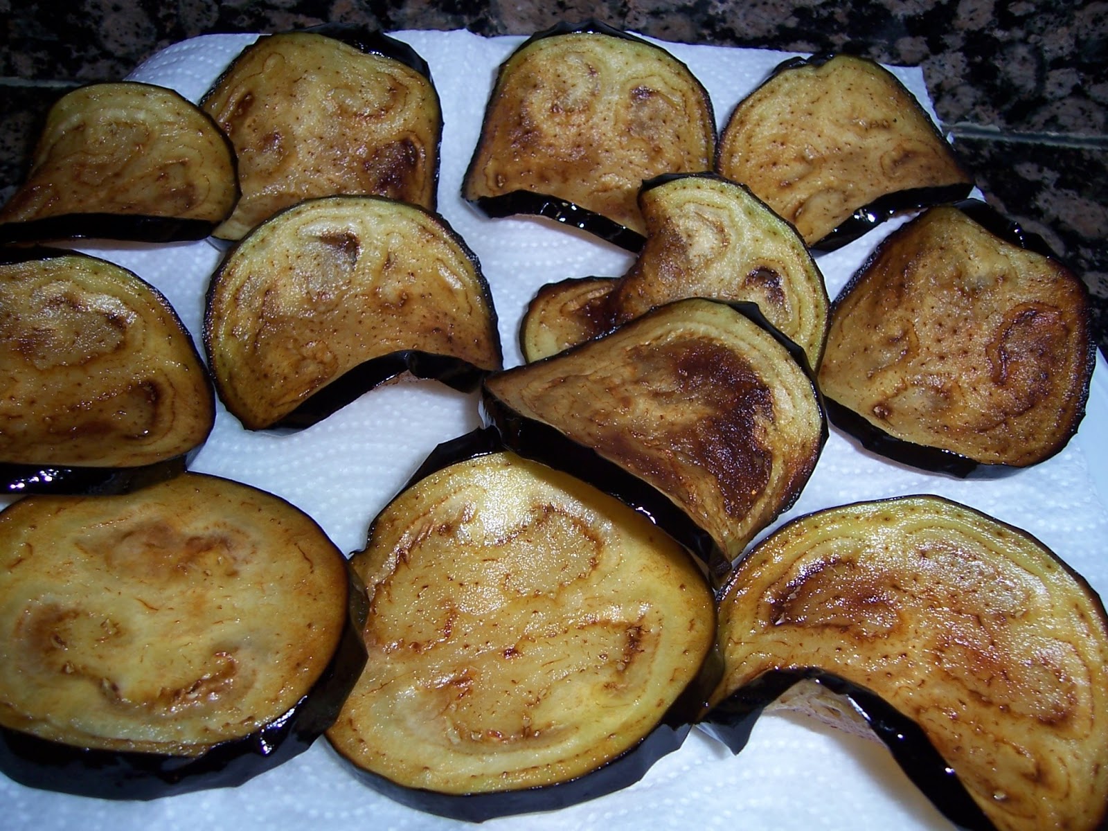 Lavamos y cortamos la berenjena en rodajas finas y las freímos en abundante aceite caliente.
