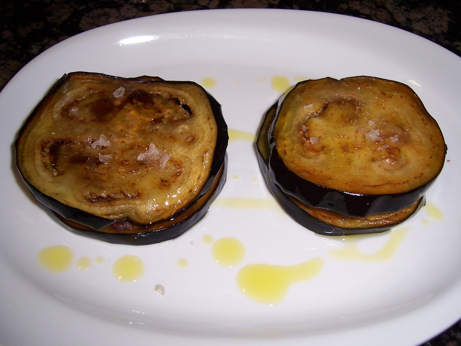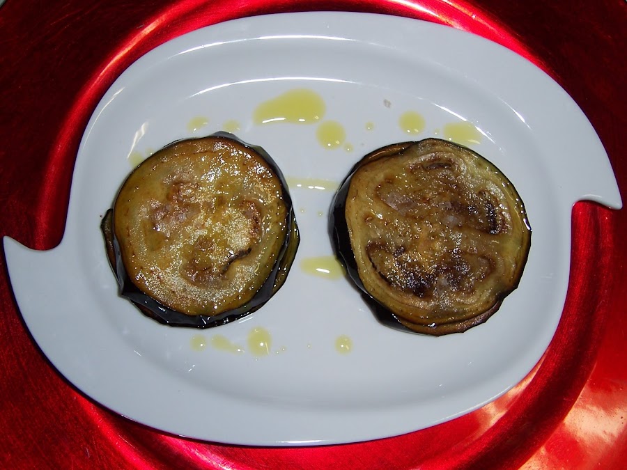 Y ya estamos listos para montar el pincho, una rodaja de berenjena, una capa de morcilla, otra berenjena, un toque de sal y unas gotitas de aceite de albahaca y listo. Buen provecho.